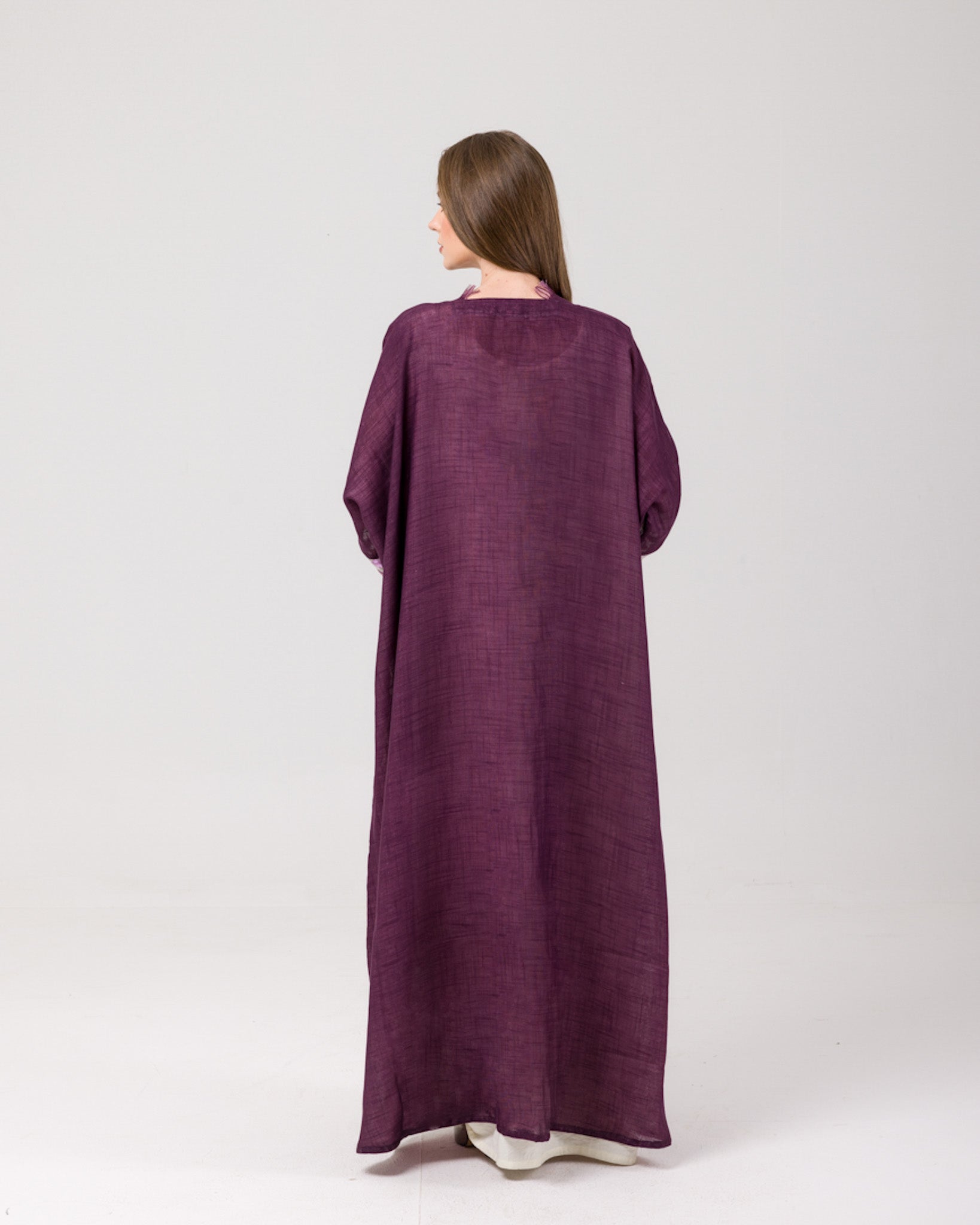 - The elegant abaya is made of fine Indian linen woven in two tonal colors, creating a sophisticated look. It features transparent organza sleeves embroidered with soft flowers, adding a feminine touch to the design. To complete the look, a pink cotton hijab is included. Together, these elements create a stylish and fashionable outfit. Available in very limited quantities ready for shipping.