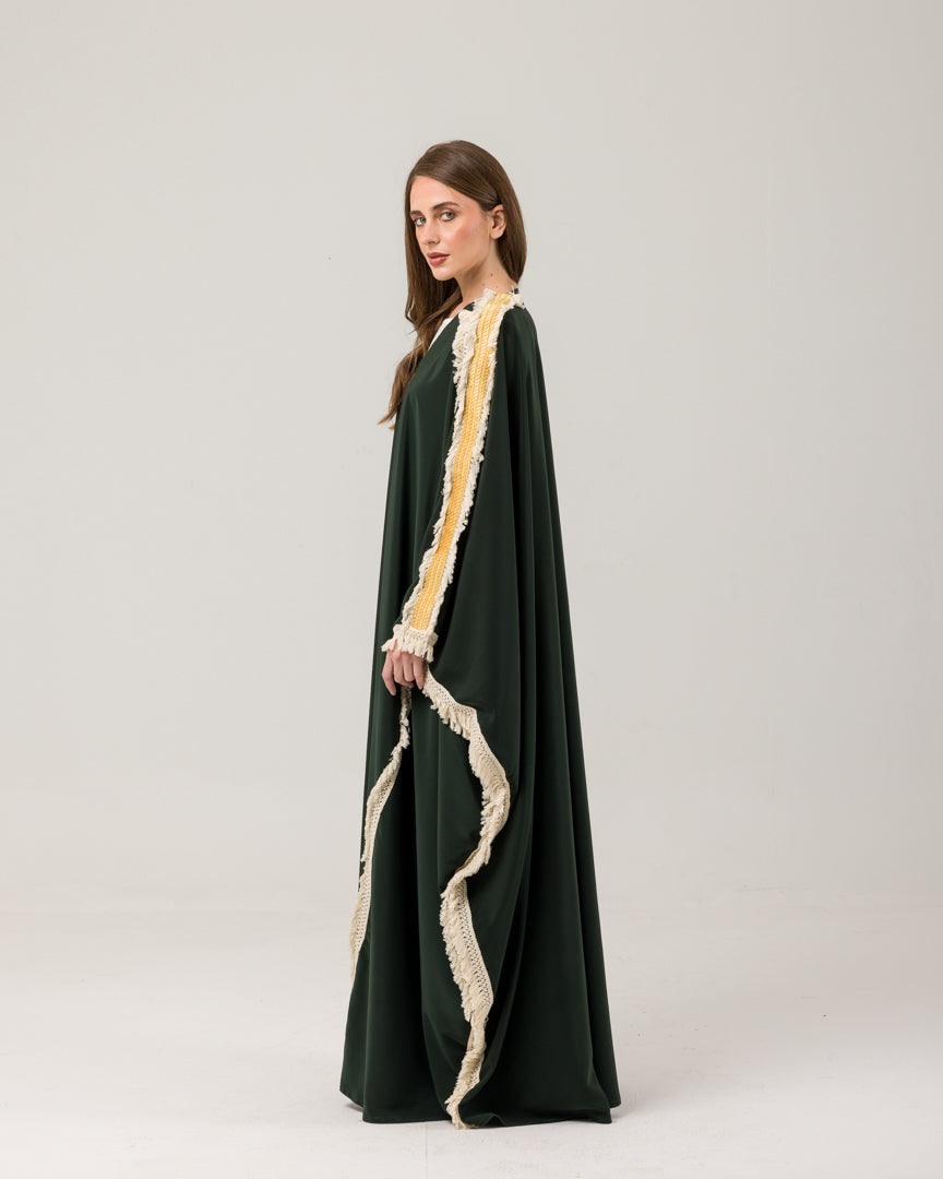 An elegant imported Japanese crepe abaya, Dark Green color, decorated with oriental golden embroidery and frills on the sleeves and edges, in addition to a light beige chiffon Hijab and a fabric belt from the same fabric as the abaya.